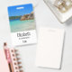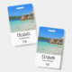 Insignia de nombre personalizada con una fotografía de una playa azul turquesa del océano con grandes rocas esparcidas a lo largo de la costa. Lugar tropical luminoso y soleado.