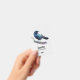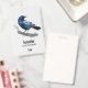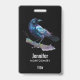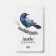 Una etiqueta de nombre con un bonito dibujo de acuarela de un cuervo. Los colores azul oscuro y violeta acentúan la belleza de este pájaro.