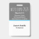 Insígnia de evento vertical personalizada en gris oscuro, blanco y colores azul de luces policiales. Todos los elementos son cambiables para adaptarse a sus necesidades. Elementos: nombre del evento, fecha del evento, ubicación del evento, nombre del asistente al evento, título del asistente al evento. Ranura en la parte superior para un cordón. También disponible en orientación horizontal en esta tienda.