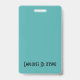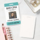 Personalizar las placas de identificación de la foto de su empleado. Todos los detalles se pueden modificar o eliminar. Foto, nombre, empresa, departamento/división/título. Recortar texto negro sobre fondo blanco con bordes verde azulados en la parte superior e inferior. Cada detalle se puede personalizar, incluyendo colores y fuentes. Punto para información adicional sobre el reverso de la insignia, si es necesario. Si no, se puede eliminar. TARJETA DE NEGOCIO DE COINCIDENCIA DISPONIBLE EN OFFICE->TARJETAS DE NEGOCIO
