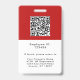 Una tarjeta de identificación profesional de la empresa con foto, nombre y título del empleado en la parte delantera junto con el logotipo de su empresa. La parte posterior de la insignia tiene una plantilla para el código QR de su sitio web de la empresa y la información adicional de la empresa que desee. Todo el texto puede ser editado como prefiera. El diseño rojo y blanco colorido es atractivo y profesional.