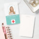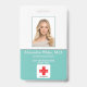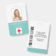 Foto ID Empleado Hospital Médico Profesional acua o placa turquesa y blanca. Un sencillo y moderno código de identificación de foto de nombre profesional para médicos diseñado profesionalmente como plantilla en línea para un centro de salud u hospital con capacidad para reemplazar la foto del personal, la plantilla de logotipo, el nombre del empleado y el título profesional. En la parte posterior, agregue más información, como la dirección de devolución, el código de barras y el número de identificación del empleado. Ideal para los logotipos de la empresa en forma de redondo.