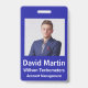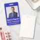 Personalizar las placas de identificación de la foto de su empleado. Todos los detalles se pueden modificar o eliminar. Foto, nombre, empresa, departamento/división. Texto en blanco en el fondo azul real. Cada detalle se puede personalizar, incluyendo colores y fuentes. Punto para código de barras en reverso de placa, si es necesario. Si no, se puede eliminar.