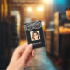 Tarjeta de identificación moderna de identificación de negocios fotográficos con código de barras sobre fondo de encaje floral. Se puede agregar información adicional al dorso de este identificador de negocio
