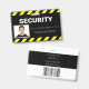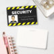 Este identificador de foto personalizado muestra una fotografía a la izquierda con el nombre de la empresa u otro texto, y el nombre del empleado a la derecha. El título "SEGURIDAD" se imprime encima en negrita y blanco sobre fondo negro. Puede incluir el nombre de su empresa o el texto adicional debajo de la imagen, así como un nombre de empleado.