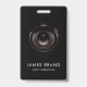 Una moderna placa de identificación para fotógrafos que muestra tu nombre y cargo, así como una lente de cámara sobre fondo negro. Ideal para los fotógrafos a los que les gustaría identificarse como tales durante los eventos de trabajo.