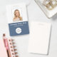Un simple y moderno distintivo médico profesional de identificación fotográfica diseñado profesionalmente como una plantilla en línea para un centro de salud o hospital con la capacidad de reemplazar la foto del personal, la plantilla del logotipo, el nombre del empleado y el título profesional. En la parte posterior, agregue más información, como dirección de devolución, código de barras y número de identificación del empleado. Excelente para logotipos de empresa redondos.