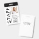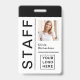 Este moderno y llamativo distintivo de identificación de la empresa para su personal es mucho más moderno y elegante que cualquier viejo distintivo de identificación. El diseño en blanco y negro presenta una tipografía grande y audaz, con un arreglo minimalista de líneas y espacio para la foto de su empleado, así como un lugar para el logo de su empresa o evento. En la parte posterior de la insignia hay espacio para más información, si es necesario. Esta insignia es lo suficientemente profesional para su conferencia corporativa o profesional o oficina estándar, pero lo suficientemente actualizada para su entretenimiento o evento musical o personal de conciertos y seguridad.