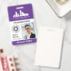Identificación vertical de empleado con un color de acento morado. Agregue foto, 2 logotipos, nombre, título, número de identificación y más para una identificación de empleado de aspecto profesional. Una identificación de empleado práctica y profesional personalizada con foto, un logotipo más grande y uno más pequeño, junto con título, nombre comercial y nombre.