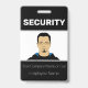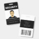 Este distintivo de identificación de foto personalizado muestra una fotografía en el centro. El título "SEGURIDAD" se imprime sobre él en negrita y blanco sobre fondo negro. Puede incluir el nombre de su empresa o el texto adicional debajo de la imagen, así como el nombre de un empleado. La parte posterior de la insignia incluye información adicional sobre empleados o empresas impresa sobre un fondo negro, con un código de barras de ejemplo colocado en la parte inferior. Puede reemplazar el código de exploración por otra imagen propia, como el logotipo de un personalizado.