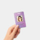 Tarjeta de identificación moderna de negocio fotográfico con código de barras sobre un fondo de rayas diagonales púrpura y rosa. Se puede agregar información adicional en el reverso de esta credencial de negocio