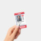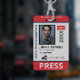 Identificación de prensa vertical con rojo y azul como colores de acento. Agrega foto, logotipo, nombre, título, número de identificación y más.
