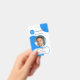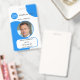 Insigne de identificación fotográfica con su foto y logotipo personalizados en un diseño retro azul blanco y colorido. El área de texto inferior en la parte delantera muestra una forma rectangular, que se puede escalar en el editor avanzado. En la parte posterior puede agregar un código de barras o código QR personalizado y textos adicionales (o eliminar las plantillas). Ideal para crear una presencia llamativa.