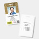 Cargue fácilmente su propio logotipo, foto, código QR o código de barras. Destácate de la multitud con un brillo divertido y delicioso en las identificaciones de su personal. El texto adicional dice "Totalmente vacunado". La plantilla editable incluye nombre, cargo, calificación, fecha de emisión y validez. Insígnia de identificación con código QR de brillo dorado. Vea nuestra colección para más ideas geniales de identificaciones.