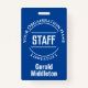Una insignia para un miembro del personal. Cambie la redacción a sus detalles. Miembro de la placa del personal. Insignia de empleado para un patio o clip. Insignia oficial del personal. Texto blanco sobre fondo azul.