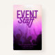 Da a tu equipo de eventos una imagen pulida y profesional con esta insignia de personal de eventos morado. Con una silueta de multitud animada, un efecto luminoso brillante y una tipografía violeta audaz, esta insignia es ideal para conciertos, espectáculos en vivo, fiestas y festivales. Personalizar con el nombre de su organización y la fecha del evento para una fácil identificación y una coordinación elegante. Ideal para los voluntarios, la seguridad o los equipos de producción que trabajan en el frente o detrás del escenario.