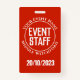 Una insignia para un miembro del equipo de eventos. Cambie la redacción a sus detalles. Insignia del personal del Festival. Insignia del personal de eventos para un patio o clip. Insignia oficial del personal del evento. Texto blanco sobre fondo rojo.