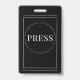 Modelo metálico oro y negro Insignia para eventos de prensa. Reemplazar por su propio nombre y fecha de evento. Esta versión viene con un patio, pero puede elegir su estilo de conexión que incluye, lanyard, clip metalizado o retráctil, o ningún adjunto.