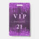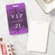 Una insignia moderna, elegante y glamurosa para una fiesta de cumpleaños 21 (o de cualquier edad). Fondo violeta profundo con goteo purpurina falso morado, pinta goteando. El color de fondo morado es desigual. Personalice y agregue un nombre. El nombre está escrito con un guión moderno de estilo con letras a mano con toques. El texto: El número VIP 21 está escrito en un color rosado. Para que los cambios sólo eliminen el nombre del ejemplo, deje los espacios o la emoji delante y después del nombre. Atrás: los detalles de su fiesta.