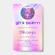 Invitación a una fiesta 21ª (o a cualquier edad) femenina y femenina. Fondo holográfico de color morado, rosa, amarillo, azul. Decorada con una bola de discoteca de colores. Texto: ¡Vamos Fiesta! Personalice y agregue un nombre y detalles del fiesta. El nombre está escrito con un guión de estilo con letras a mano, letras de color púrpura. Atrás: sin diseño ni color (menos costoso)