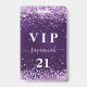 Una insignia moderna, elegante y glamurosa para una fiesta de cumpleaños 21 (o de cualquier edad). Un fondo violeta y rosa con un fondo morado. El color de fondo morado es desigual. Personalice y agregue un nombre. El nombre está escrito con un guión moderno de estilo con letras a mano con toques. El texto: número VIP 21. Para que los cambios sólo eliminen el nombre del ejemplo, deje los espacios o la emoji delante y después del nombre. Atrás: los detalles de su fiesta.