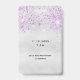 Una insignia moderna, elegante y glamurosa para un chica de Quinceañera, 15 años de fiesta. Una moda imita el fondo plateado con un falso purpurina de color lavanda. El nombre está escrito con una escritura de estilo con letras a mano moderna. Con el texto: El número VIP 15 está escrito con un tipo de letra, guión, estilo globo. Fecha de nacimiento: fiesta y dirección del lugar de celebración.