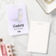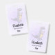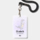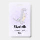 Insignia de nombre personalizada con un lindo ilustracion con un dinosaurio morado grisáceo.