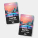 Una etiqueta con un bonito diseño gráfico con un tranquilo lago de ciervos y altos pinos reflejados en el agua. Las estrellas se ciernen sobre sus cabezas.