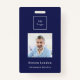 Fondo azul marino, texto blanco. Añada el logotipo de su empresa, una foto, nombre y título. Atrás: agregue el nombre de la empresa, la dirección y agregue la dirección URL de su sitio web al código QR.