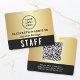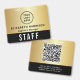Custom access pass badge featuring logo branding, QR code functionality and an elegant black and gold background. The front showcases your logo and team member's name and title in a clean, easy-to-read layout, while the bold “STAFF” (or "CREW," "VIP," "VENDOR," etc.) designation ensures instant recognition from a distance. On the back, a large QR code provides a modern option for check-ins, credentials, schedules, or access control -- making this badge as functional as it is stylish. Perfect for corporate events, conferences, productions, and large-scale gatherings, this badge helps your team stay organized while reinforcing a polished, cohesive brand presence.