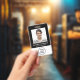 Insignia negra moderna y profesional para el nombre de los empleados que incluye su foto, nombre y título, y el logo de su empresa u organización. En el reverso, agregue cualquier información adicional y código QR opcional.