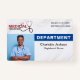 Tarjeta de identificación médica profesional en azul y blanco, con foto de empleado, nombre, cargo, departamento, fecha de emisión/vencimiento y código de barras. Ideal para el personal hospitalario, enfermeras, médicos o empleados de la clínica. Personalizable con su logotipo e instrucciones de devolución. Una solución pulida y segura para la identificación de la salud.