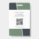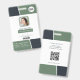 Professional identification card with photo, logo, barcode, and qr code templates included. This modern design style has shades of muted green and black with white base. Similar design on back, with business address, website address, and a website qr code.