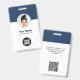 Personalice fácilmente esta Tarjeta de identificación de empleado minimalista y personalizada con foto, escanee el código Qr o el código de barras y el logotipo de la empresa. Un diseño empresarial simple con foto redonda, en colores azul marino y blanco totalmente personalizables en tamaños delanteros y traseros, fuentes básicas y modernas sans-serif y una apariencia profesional y clara. Disponible con cordón, clip de metal o retráctil. Sin pedido mínimo.