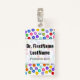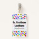 Porciones de las características del este diseño de la insignia de círculos/de puntos de diversos colores. También ofrece un nombre personalizado en texto coloreado negro dentro de un área de color claro. Hay también un mensaje adaptable bajo el nombre ese podría mostrar la información tal como un cargo, o una profesión, o un nombre del negocio/de compañía. [~Z0000176]