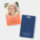 Una insignia moderna de la foto que ofrecía un naranja acodó diseño geométrico en el frente donde usted puede también añadir su foto y un lado trasero del color azul. Perfeccione como insignia de la oficina para que su personal y también una gran manera se presenten en las reuniones o los acontecimientos.