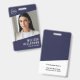 Navy Blue Modern Employee ID Badge with Photo and Logo. This sleek and contemporary vertical ID badge is perfect for corporate employees, small business teams, or event staff who want a clean and professional look. The front features a bold navy blue background with angled accents at the top and bottom for a modern touch. Your company logo is placed in the top left corner within the navy design, while your name and job title appear clearly in the bottom right for easy identification. Your photo is centered for a personalized and official appearance.