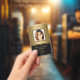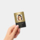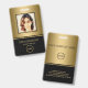 Negocio de fotos moderno con foto sobre fondo dorado y logotipo. Se puede agregar información adicional en la parte posterior de esta credencial de identificación