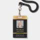 Tarjeta de identificación de foto moderna en negro y oro con espacio para una foto de perfil de personalizado, título de trabajo, detalles de contacto, servicios y código de barras. Este elegante distintivo de nombre de empleado presenta un fondo negro y falsos efectos dorados con texto completamente editable y una foto.
