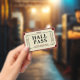 Un estudiante retro moreno oscuro y rojo burdeos pase la entrada de la insignia del cine de cine. Excelente para un profesor de primaria.