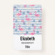 Tarjeta de nombre personalizada con un patrón con un divertido ambiente de verano. Flamencos rosados y piñas puestas en un patrón de rayas azul claro con hojas y corazones alrededor.
