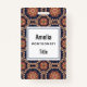 Marca de nombre con un patrón repetitivo de elementos decorativos ornamentados en formas florales, estelares y solares.