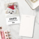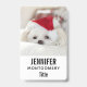 Una etiqueta con un nombre con una adorable foto de un adorable perro blanco usando un gorra de navidades rojos.