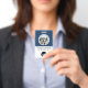 Un diseño empresarial básico que destaca los logotipos de su oficina y el nombre del empleado. Puede agregar un código de barra de exploración en la parte frontal y posterior. También puede cambiar el color del fondo.