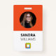 Personalizado moderno y profesional imprime la insignia de empleado corporativo que aparece en el naranja. Añade cualquier nombre comercial y de empleado, foto, logotipo, dirección, número de teléfono, sitio web y código de barras. Disponible en varios colores para la identidad empresarial.