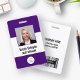 Esta insignia presenta un fondo sencillo, moderno, morado y blanco para un aspecto profesional. Personalizar con tu foto cuadrada, nombre, cargo, logotipo, nombre de la empresa, dirección u otra información, y código de barras opcional.