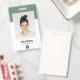 Personalice fácilmente esta Tarjeta de identificación de empleado personalizada con foto, código de barras de escaneo y logotipo comercial. Un diseño empresarial simple en elegante verde salvia y colores blancos totalmente personalizables en tamaños delanteros y traseros, fuentes básicas sans-serif y modernas y una apariencia profesional y clara. Disponible con cordón, clip metálico o retráctil. Sin pedido mínimo.