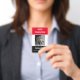 Plantilla de placa de identificación de empleado con foto personalizada roja y negra. Agregue el nombre de su empresa, el nombre del empleado y el cargo del empleado. Sube tu propia foto.