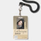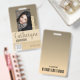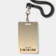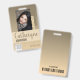 Nombre Badge con fondo oscuro color crema, foto, código de barras y plantilla de logotipo. personalizar fácilmente esta placa a tu marca.