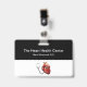 Plantillas elegantes de placas de nombre médico para un cardiólogo en un centro de atención cardíaca, hospital o sala de emergencias. Creado con un diseño simple moderno de dos lados con espacio para el nombre de su empresa y personal médico diseñado con un símbolo de corazón y estetoscopio. Presentado con el accesorio de clip, pero también disponible con cordones. Un estilo económico.
